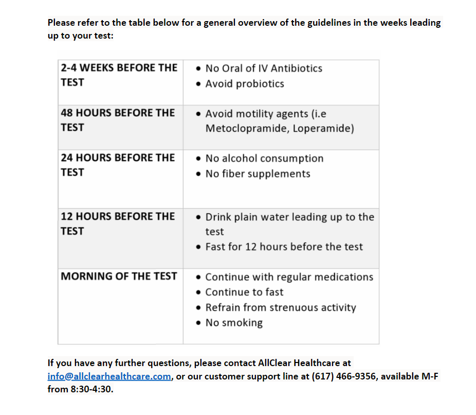 Please direct any initial questions related to preparation to your physician or nutritionist. Breath Test Prep Instructions